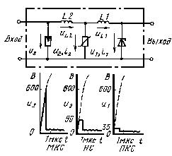 Элементы, ограничивающие перенапряжения в этой области, должны, с одной стороны, обладать способностью отводить сильные импульсные токи (до 10 кА), а с другой - быстро ограничивать перенапряжения, близкие по значениям к рабочим напряжениям. Эти требования удовлетворяются в многоступенчатых схемах. На рис. 5.2 приведена схема одного из таких устройств, состоящего из газонаполненного разрядника, металлооксидного варистора (грубая защита) и ограничительного стабилитрона (тонкая защита). При появлении импульса перенапряжения сначала срабатывает стабилитрон. Ток i1 вызывает падение напряжения на индуктивности L1 UL1=L1di1/dt, что приводит к срабатыванию варистора. Под воздействием напряжения UL2=L2di 2/dt разрядник пробивается. Таким образом приходящий импульс (10 кВ) со скоростью изменения 1 кВ/мкс ступенчато ограничивается до 35 В.